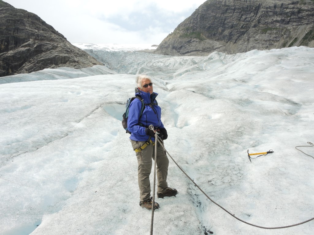 Aan de rand van het ijs krijgen we een klimgordel uitgereikt en gaan we aan het touw. Een mooie tocht volgt over het blauwe ijs van de gletsjer, nu het zomer is natuurlijk zonder losse sneeuw maar wel met beekjes die over het oppervlak stromen en hier en daar in een gat verdwijnen. Het gaat licht regenen maar daar waren we gelukkig op voorbereid.