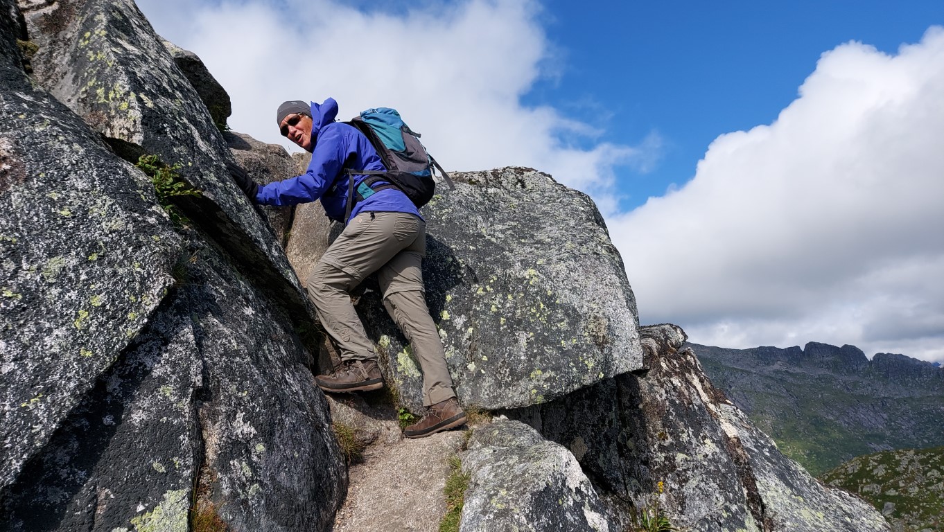 De volgende dag trekken we met de camper wat hogerop de bergen in boven Svolvaer en beginnen een aanbevolen wandeling. Helaas, na een half uur blijkt een essentiële brug niet meer te bestaan. We improviseren en volgen een andere wegwijzer die ons naar een topje van 450 m leidt, een leuke dagexcursie met mooi uitzicht.